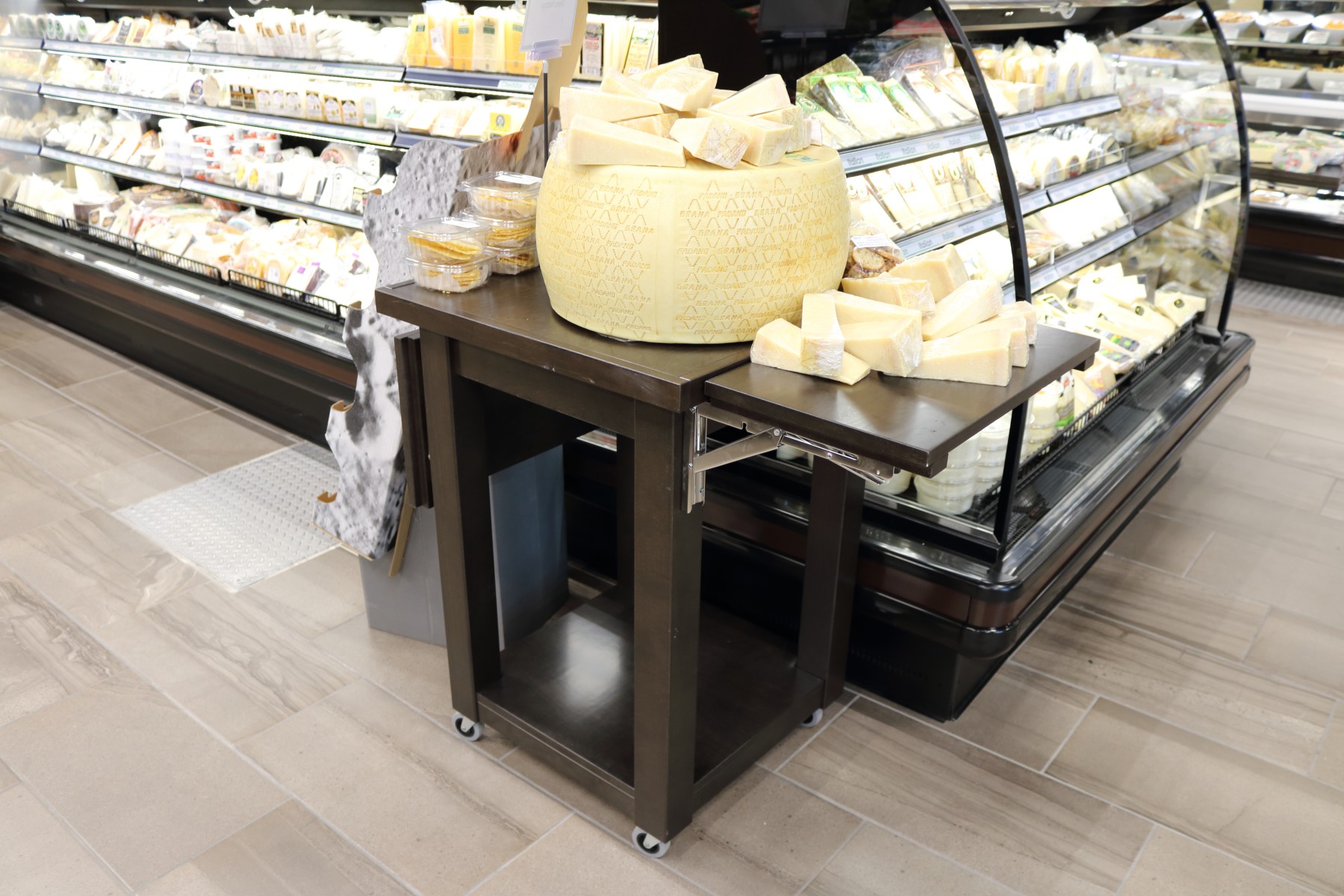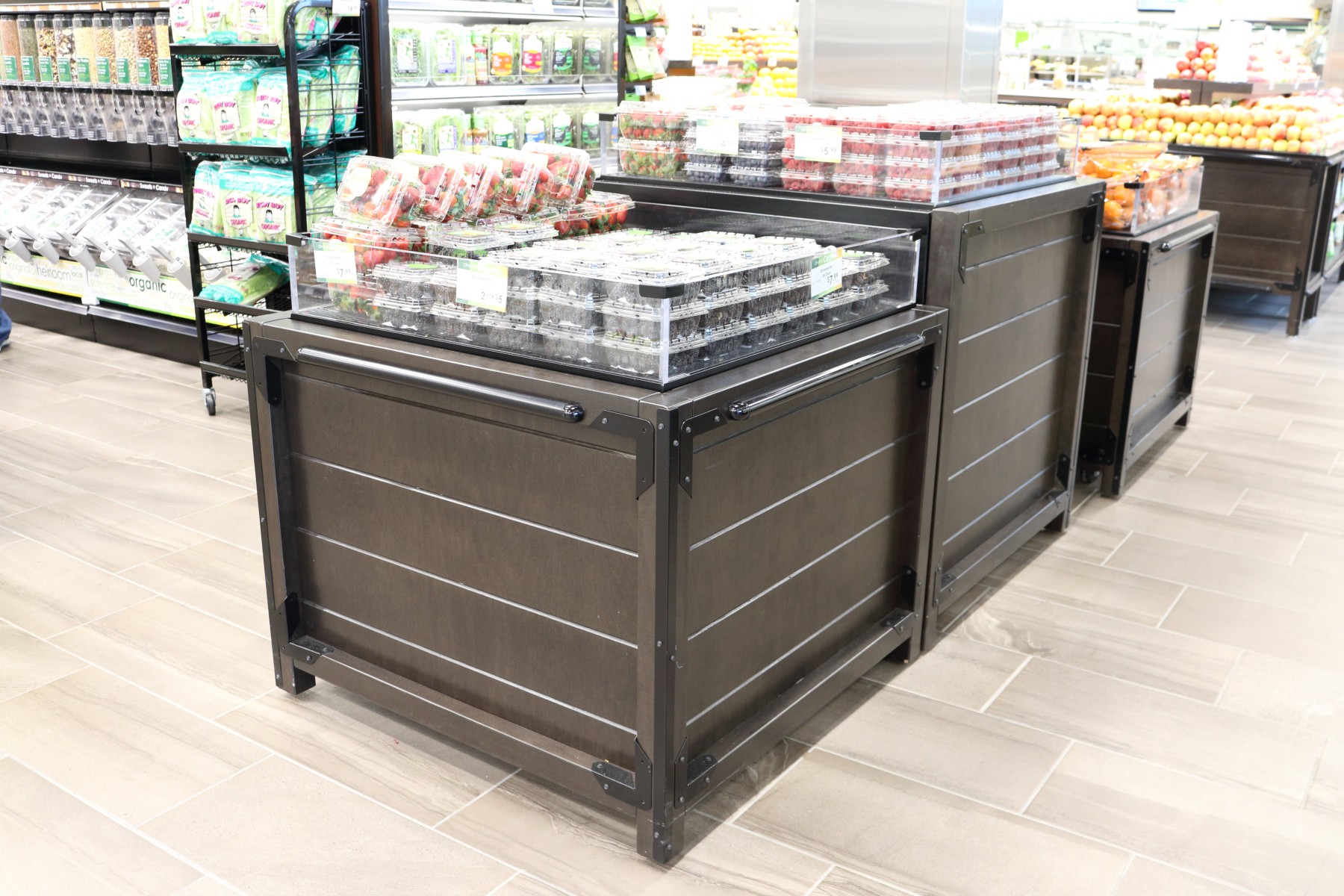 The results were a combination of standard and custom displays that included refrigerated prepared food displays, dry product tables, self-serve bars, refrigerated produce displays, a nut butter station and cosmetic displays. To complement the larger displays, we designed a series of versatile accessories like drop-leaf tables